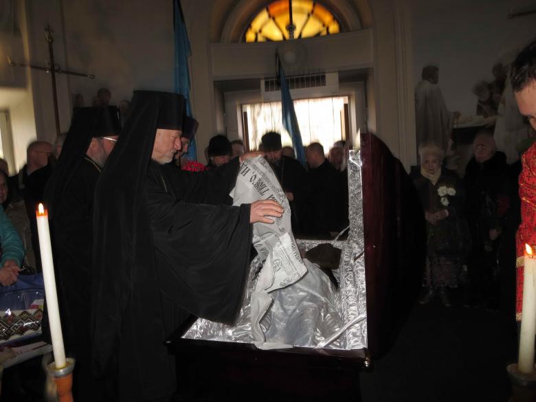 Заупокійну літію та прощання відслужили священик Української Греко-Католицької Церкви, архієпископ Сумський і Охтирський Мефодій (УПЦ КП), єпископ Вишгородський і Подільський Володимир (УАПЦ), протоієрей Дмитро Каран (УАПЦ), протоієрей Павло Стародуб (УПЦ КП). Духовенство та вірні молилися за упокій р.Б. Павла-Богдана. Під спів «Святий Боже…» тіло р.Б. Павла-Богдана винесли з храму та відправили до м. Львова для поховання на Личаківському кладовищі за заповітом покійного.